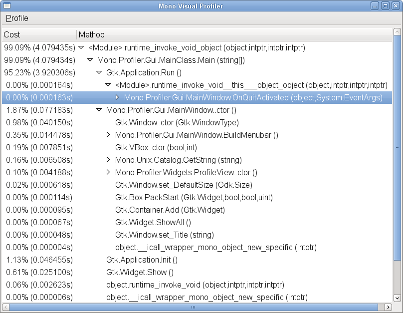 The Mono Visual Profiler is a graphical interface to the mono logging profiler. It enables users to create new profiles, save them, and view existing profile logs. The application strives to provide better data visualization than is capable via the existing cmdline profiler and file decoder.
